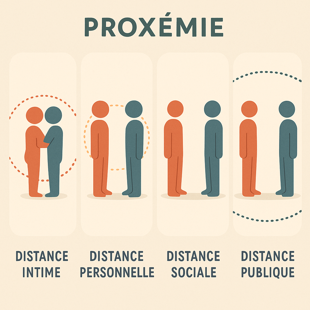 Après avoir compris pourquoi la distance personnelle est essentielle dans nos relations, voyons maintenant les quatre zones précises définies par l’anthropologue Edward T. Hall dans sa théorie de la proxémie (The Hidden Dimension, 1966). Ces zones ne sont pas de simples mesures en centimètres : elles représentent des niveaux de confiance, d’intimité et de rôle social.